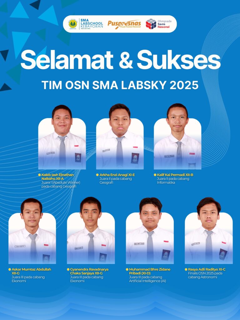 Jakarta, 15 Desember 2025 — SMA Labschool Kebayoran kembali membuktikan konsistensinya sebagai salah satu sekolah berprestasi di tingkat nasional. Pada ajang Olimpiade Sains Nasional (OSN) 2025 yang diselenggarakan di Malang pada Sabtu, 10 Oktober 2025, para siswa berhasil meraih berbagai medali dari sejumlah bidang lomba, mulai dari Geografi, Informatika, Ekonomi, Astronomi, hingga Kecerdasan Artifisial (OSN AI).